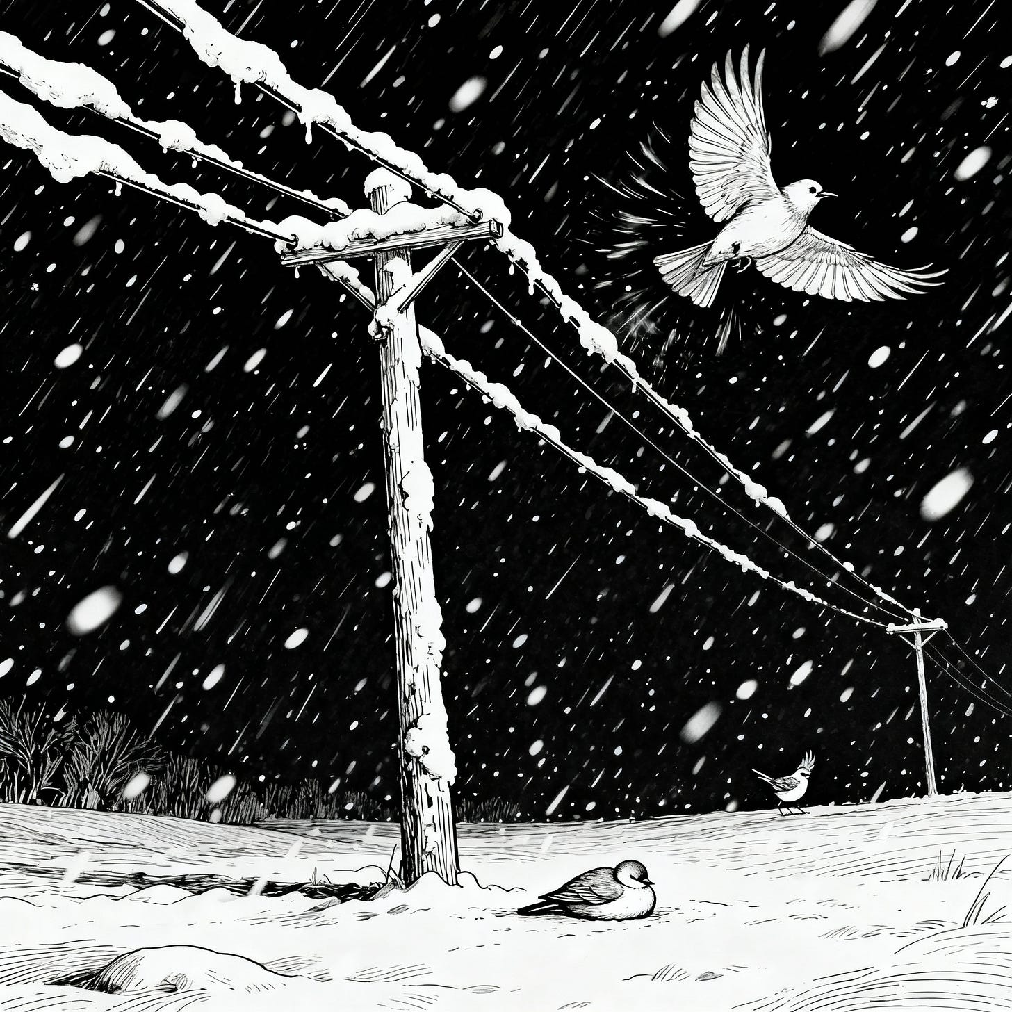 I stood in the falling snow, watching her grief play out in movements both frantic and tender. She’d fly a small circle, return to his side, call out, peck at his breast, then launch into the air again. Each loop seemed to carry the hope that this time would be different, that this time he’d stir and follow.